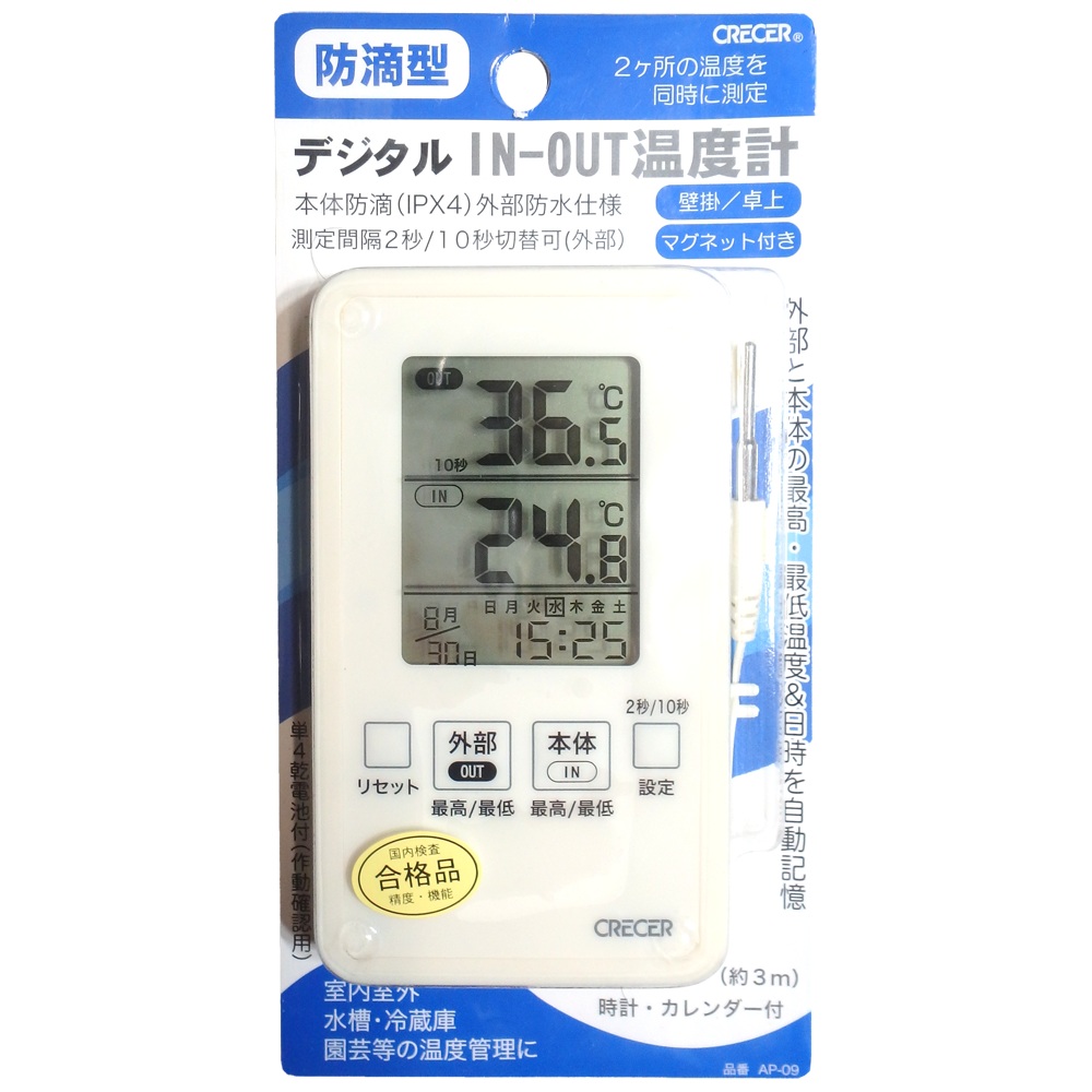 | 特徴 | ・本体は防滴(IPX4) ・外部温度センサー部は完全防水(IPX7) ・コード(約3m)は、本体に巻き付けて収納可能 ・月/日/時計を常時表示 ・外部と本体の最高・最低温度&日時を自動記憶 ・電池交換時期をアイコン表示でお知らせ ・電池付 (単四乾電池1本) |