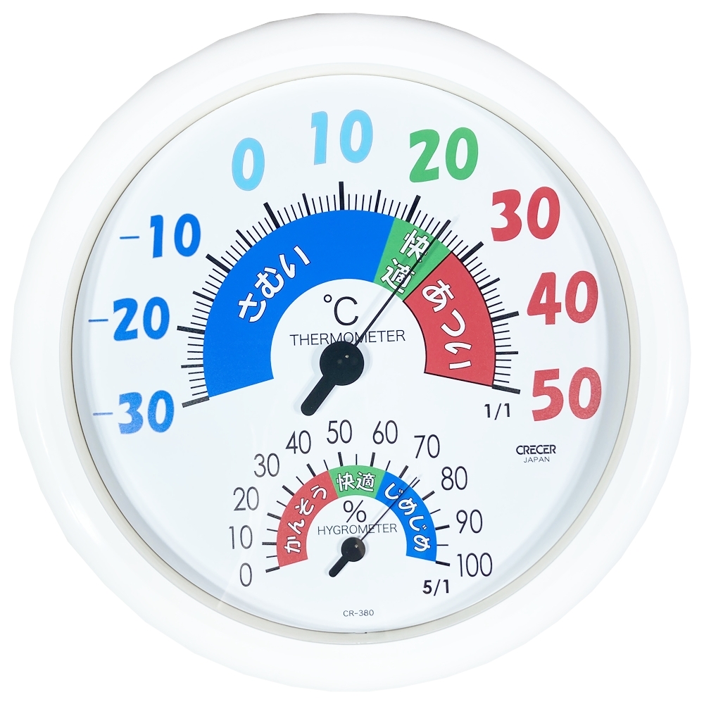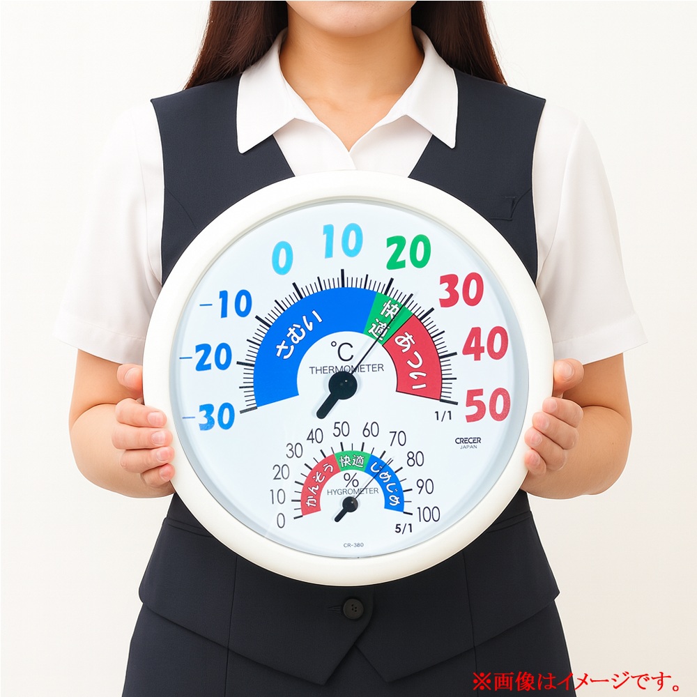 直径300mmの大型アナログ温湿度計です。快適温度・湿度の範囲を遠くからでもわかりやすい色で表現しています。