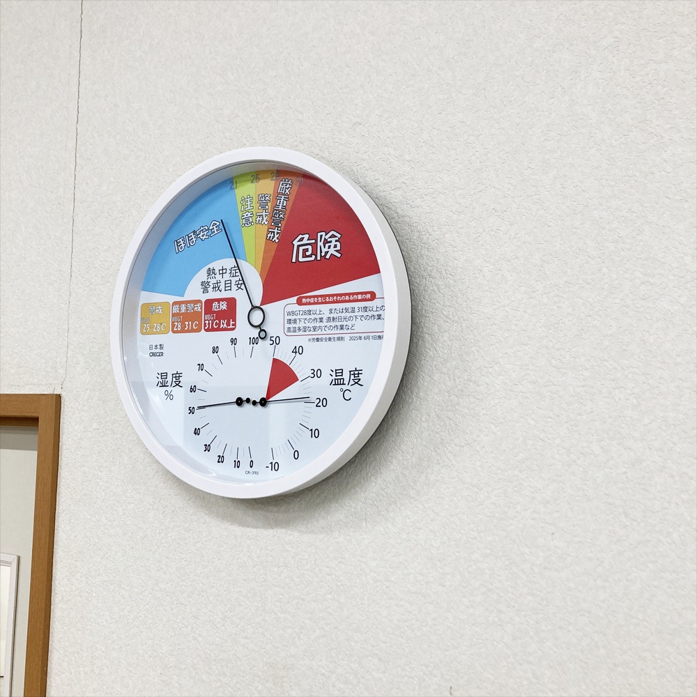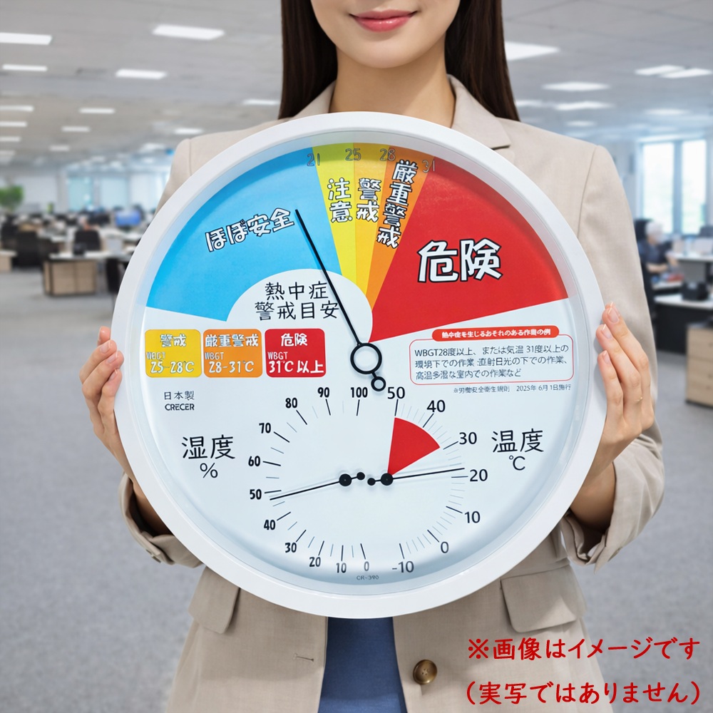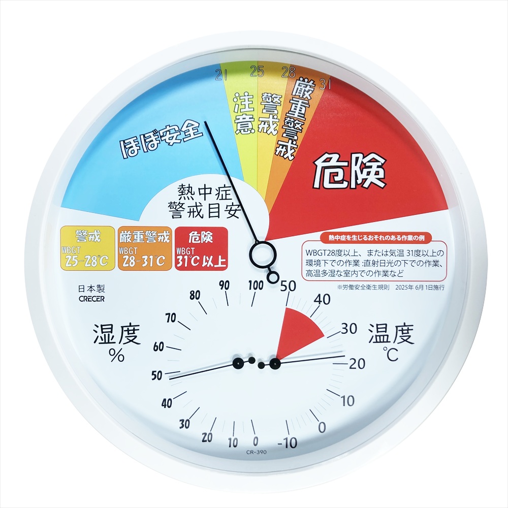 | 特徴 | ・職場における熱中症対策(労働安全衛生規則 R7.6.1施行)に、熱中症リスクのある状態になると危険度を可視化。 ①WBGT(※日射の無い環境での参考値)を色分け 暑さ指数≧31℃で赤色(危険) 暑さ指数≧28℃で橙色(厳重警戒) 暑さ指数≧25℃で黄色(警戒) 暑さ指数≧21℃で黄緑色(注意) 上記以外は水色(ほほ安全) ②温度が31℃以上で目盛板上に赤色(危険)表示 ・日本製 ・屋内専用 ・壁掛け専用 ・電源不要 ・保証期間2年間 ※JIS B 7922:2023に対応したWBGT測定機器ではありません。 |
