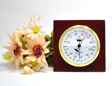 天然木を使用した高さ100mmの温湿度計です。天然木に金枠が際立ちます。| 製品仕様 | |